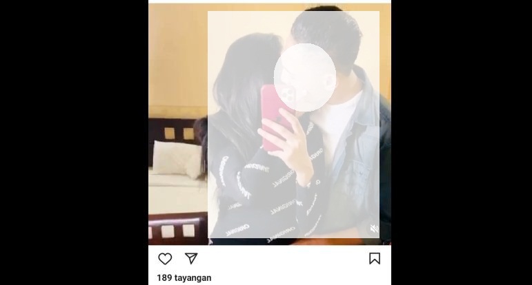 Selebgram itu sedang mengenakan baju tangan panjang berwarna hitam, sementara pasangannya mengenakan baju kemeja jeans. Disamping mereka terlihat tempat tidur dengan seprei warna putih.